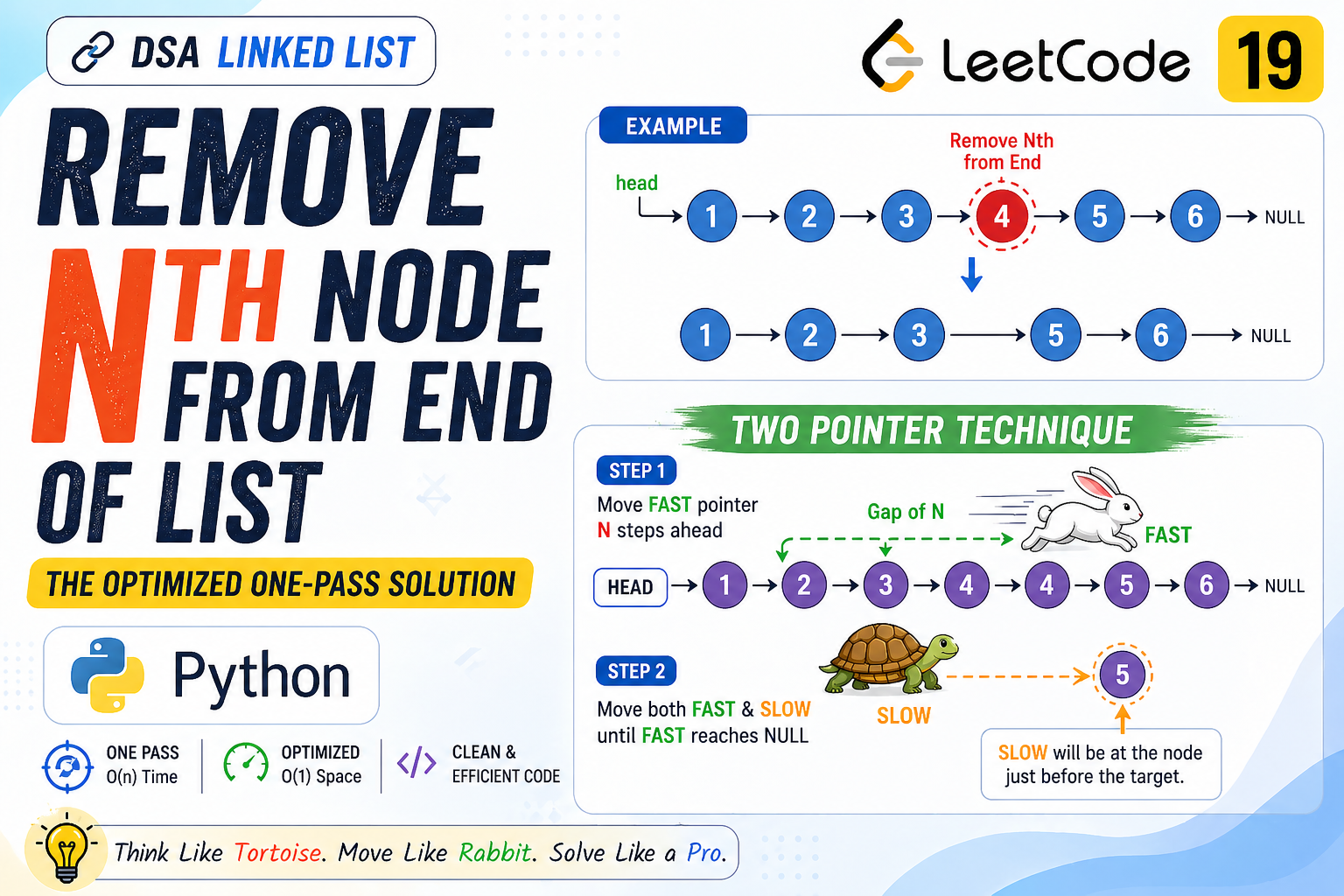 The “Pro” Way (One-Pass): Use the “Gap” logic with two pointers to find and delete the node in a single trip.