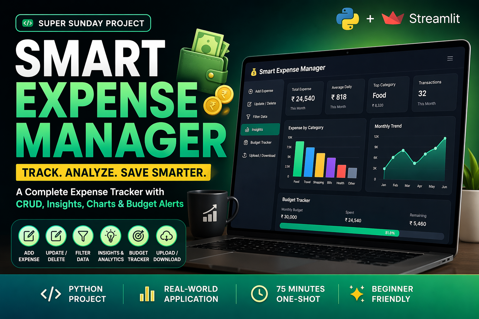 Most students understand the syntax of Python but struggle with CRUD operations (Create, Read, Update, Delete)—the backbone of 90% of all software in the industry. That’s why in this Super Sunday Project, we are moving beyond simple analysis and building a Smart Expense Manager. This isn’t just a script; it’s a complete tool with a database-style logic (using CSV) and a professional dashboard.